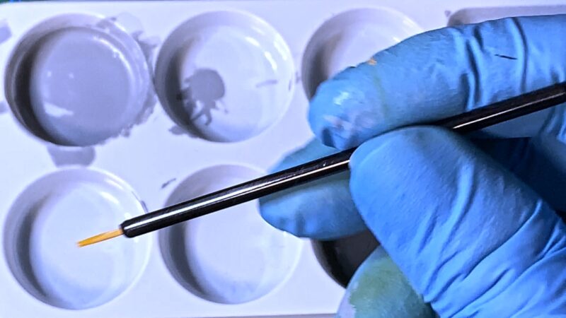 エナメルは伸びがよく、拭き取りやすく、他の塗料を侵食しないので、こういう複合工程に最適です。